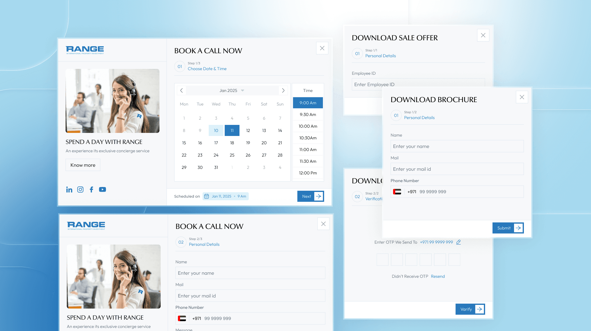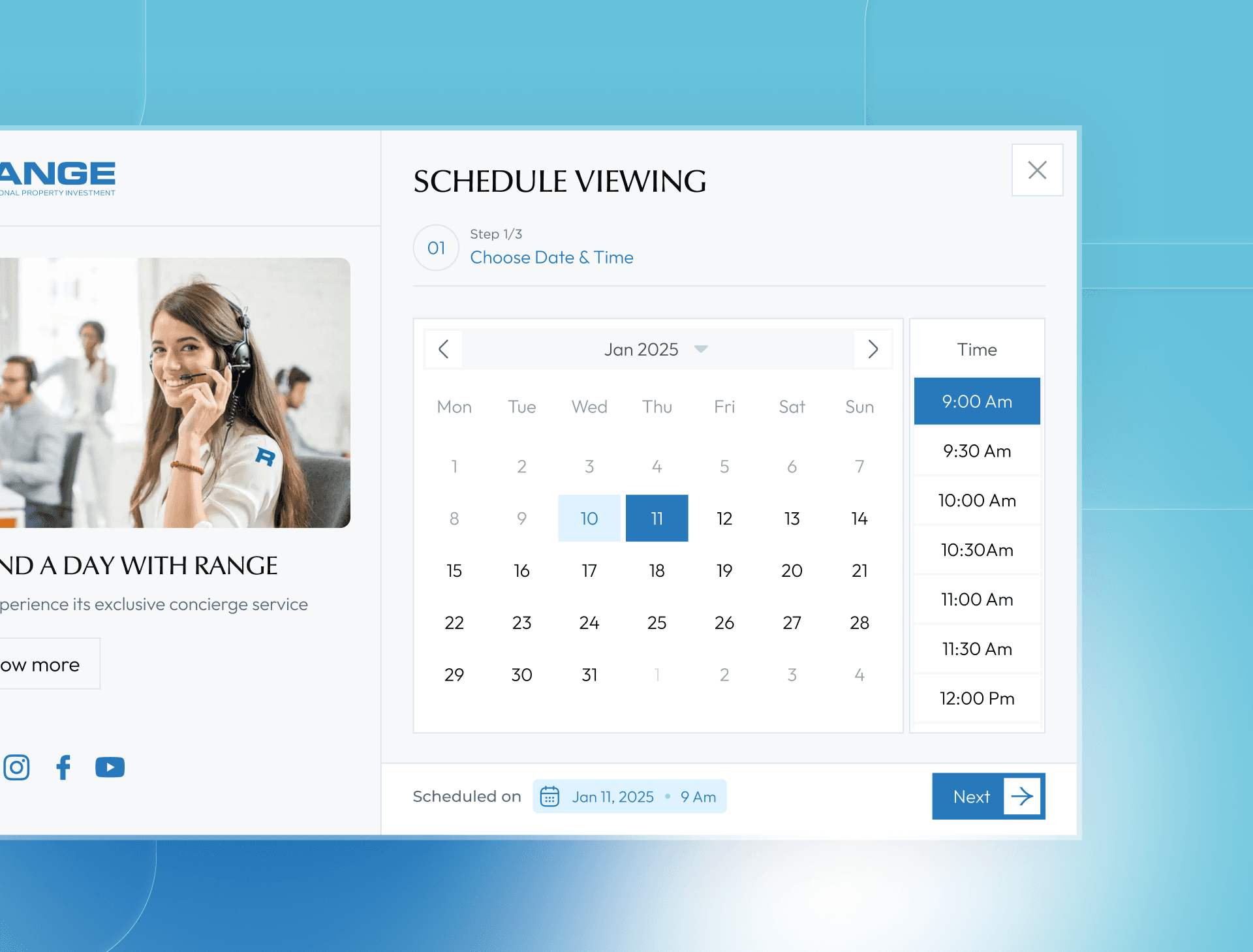 To make property view booking effortless, I designed a set of 10+ fully customizable modals that guide users through a simple 3-step process. This structure reduces friction and ensures quick completion.